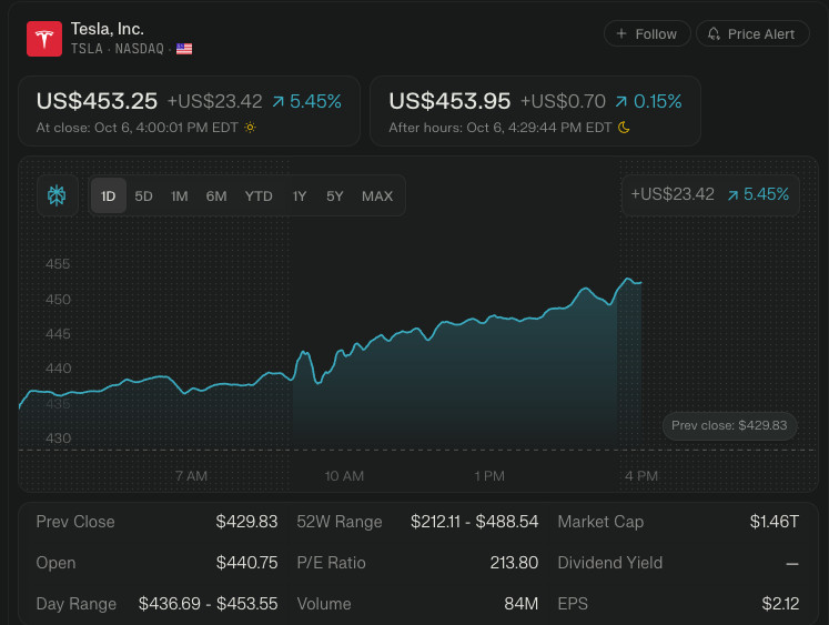 Tesla's recent performance highlights include record Q3 vehicle deliveries, exceeding 462,000 vehicles, marking a 6.4% year-over-year growth, fueled in part by expiring federal tax credits. The company also continues to lead in electric vehicle innovation, self-driving technology, and new product lines like the Cybertruck, with expansions in production capacity through new Gigafactories. Elon Musk's increased net worth, now over $500 billion, also underscores Tesla's substantial market impact.