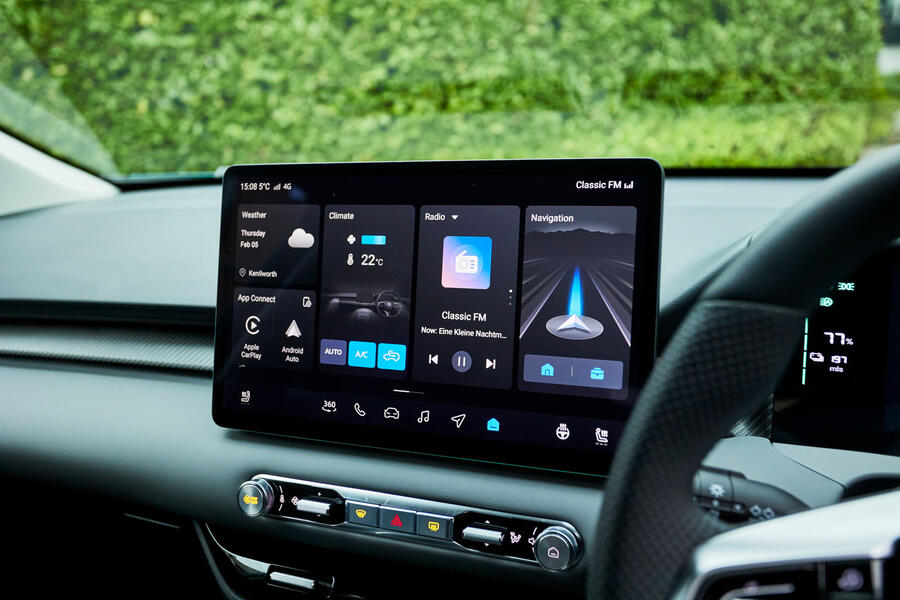 The unmarked directional pad on the steering wheel controls the media or, after pressing the star, the fan speed and temperature. Unconventional, but it works.Matt SaundersRoad test editor