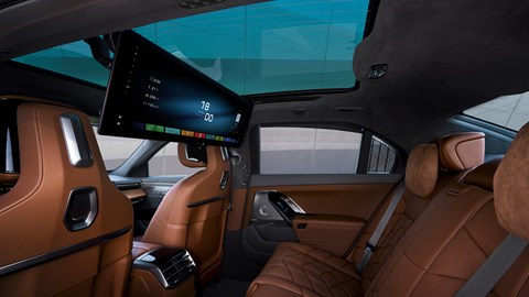 Inside, the Neue Klasse theme continues as the 7 gets the same Panoramic Vision display that sits underneath the windscreen and wraps across the width of the dash. It’s in combination with a 17.9-inch central touchscreen. We’ve tried both in the new iX3 and found it worked really well, to the point of no longer needing a head-up display.