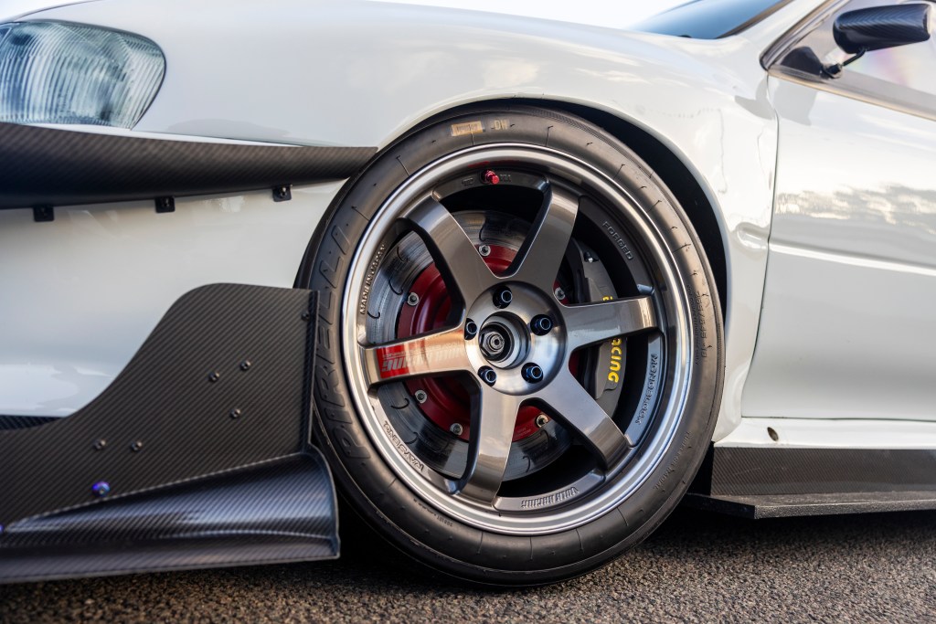 The car runs 10×18 wheels, including Rays Volk TE37 Sagas and Enkei RS05RRs depending on use, wrapped in 265-section Pirelli slicks on the day of filming. That’s serious grip, even in the hard compound.