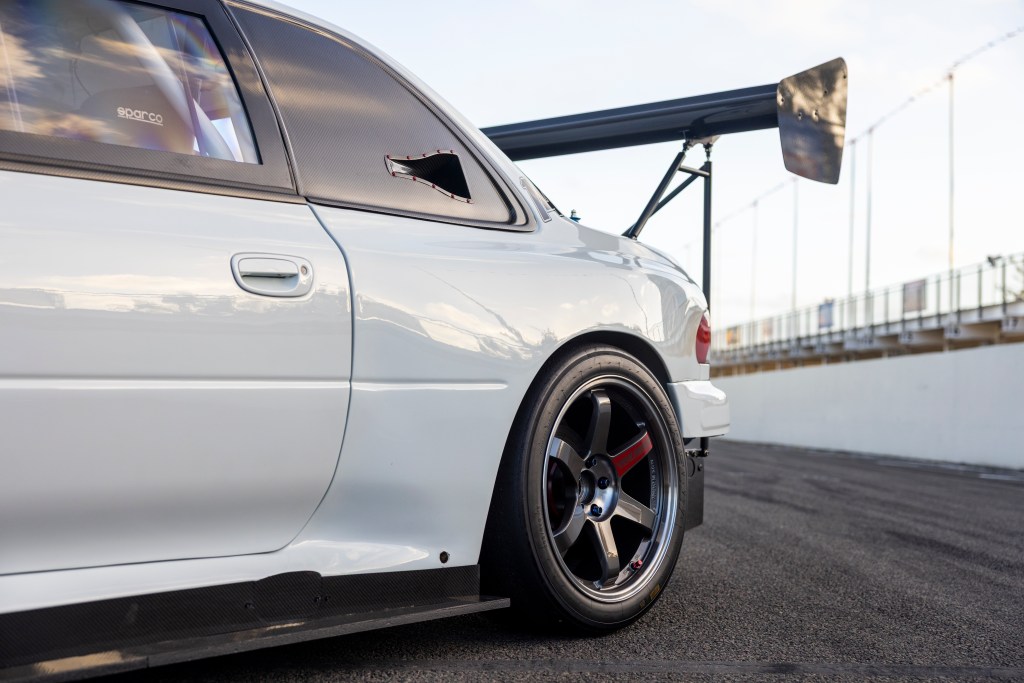 For Subaru geeks, this is an S5 WRC-style shape — effectively inspired by the 1997-era World Rally Car silhouette. Rich sourced the full carbon panels from Aerosim in California back in the Redline era, including carbon doors and the wider outer bodywork.