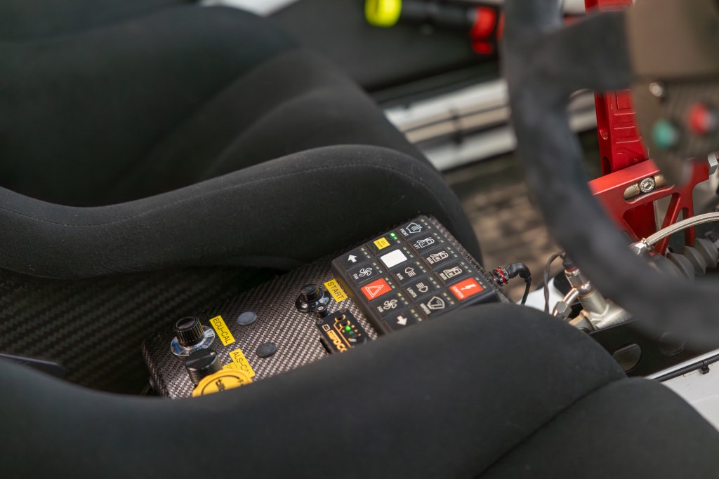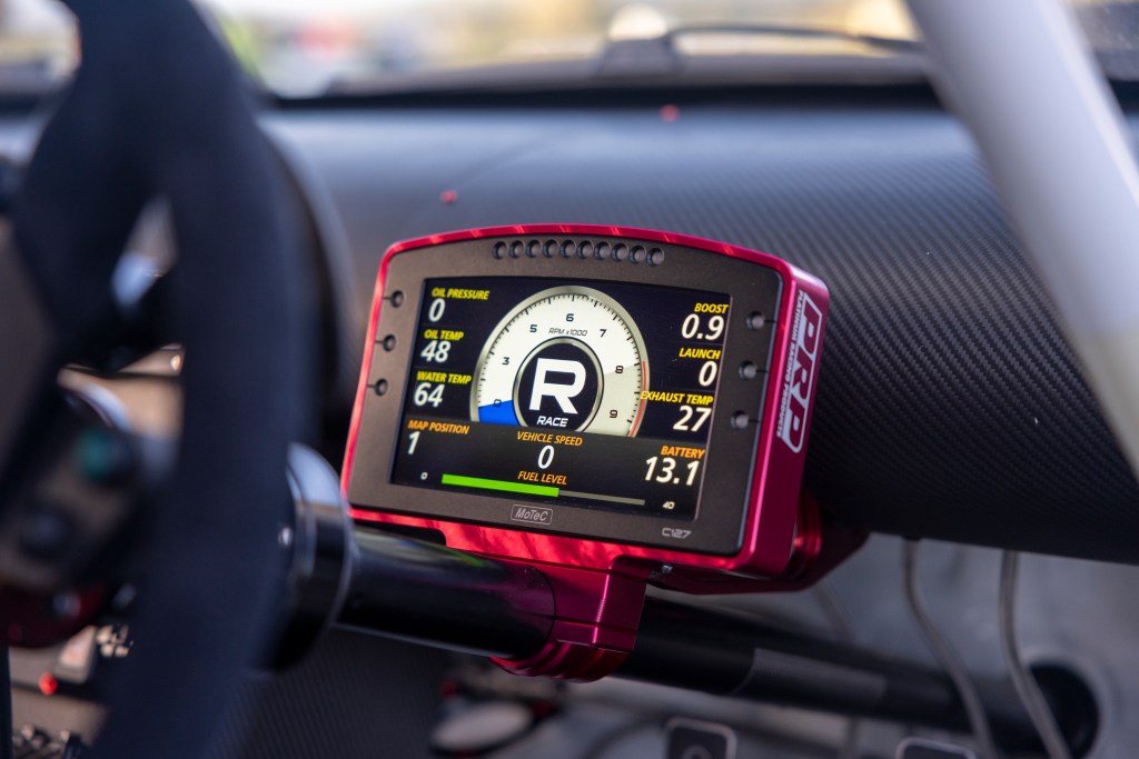 Inside, it’s full race-car. There’s a Tilton pedal box, dry sump tank, air jack controls, a Syvecs S8 ECU, MoTeC PDM, MoTeC dash and Race Technology electronics, all connected over CAN bus.