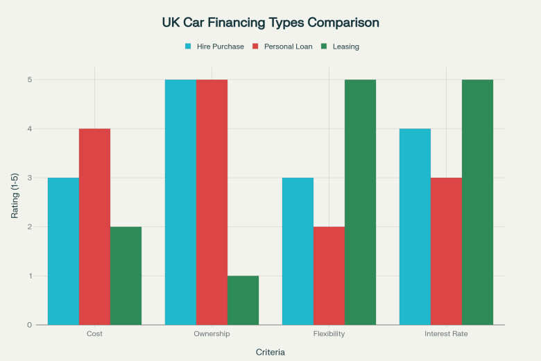 Focusing on Hire Purchase, Personal Loans, and Leasing covers the majority of UK buyers' needs and preferences. PCP can be added if you want to delve deeper into financing options.